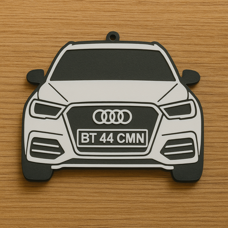 Transformă-ți pasiunea pentru mașini într-un accesoriu original! Acest breloc este creat sub forma frontală stilizată a mașinii tale preferate, cu detalii fine și personalizare completă a plăcuței de înmatriculare.