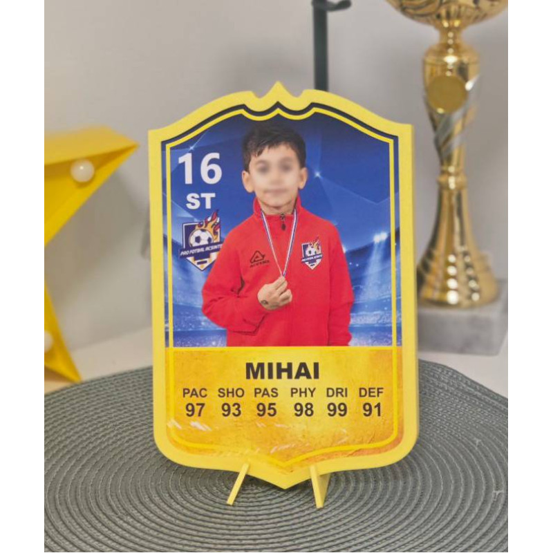 Transformă fiecare mic fotbalist într-o adevărată vedetă cu acest cartonaș de fotbal personalizat! Cu design atractiv, similar cu cardurile profesionale, cartonașul afișează numele, poza și abilitățile jucătorului, fiind cadoul perfect pentru aniversări, premii sportive sau colecții personale. Fabricat din materiale de calitate, rezistent și ușor de expus, acesta va aduce bucurie oricărui copil pasionat de fotbal.